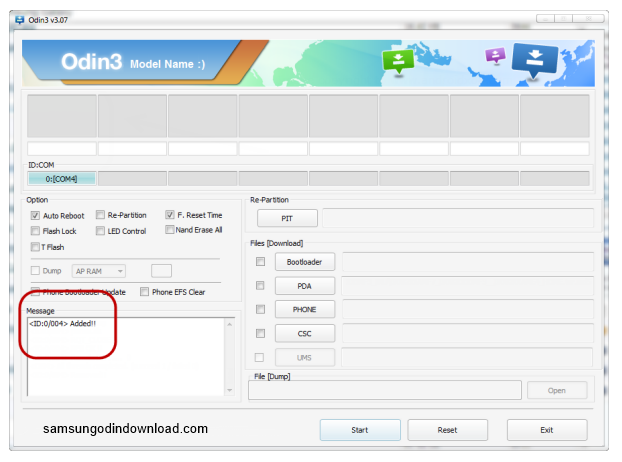 ধাপ ৩: USB ডেটা কেবলের মাধ্যমে কম্পিউটারে আপনার স্যামসাং ডিভাইস সংযোগ করুন। দেখবেন ইউ.এস.ইব ড্রাইভার ইন্সস্টল হচ্ছে এরপর Odin সফটওয়ারে COM বক্সে ত্রিভুজীয় আকারে পরিণত হয়েছে এবং ব্লাঙ্ক বোডে (>added<)দেখাবে এবং আপনার কম্পিউটারের সাথে মোবাইল সংযোগ সফল হয়েছে। আপনি যদি এরকম কোনো প্রতিক্রিয়া দেখতে না পান, USB ক্যাবল পরীক্ষা করার চেষ্টা এবং ইউএসবি ড্রাইভার পুনরায় ইনস্টল করুন.