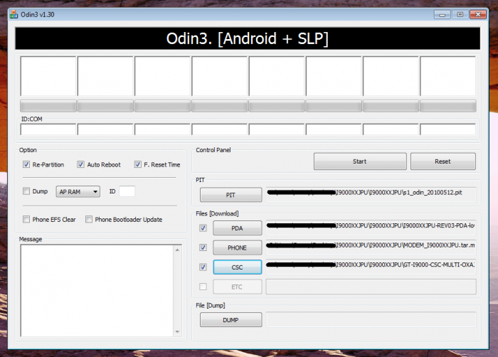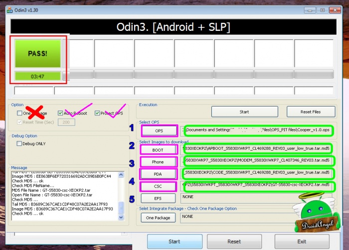 Odin "PA" থেকে ক্লিক করুন তারপর ব্রাউজ এবং ফার্মওয়্যার ফাইল দেখিয়ে দিন। তবে আপনার ডাউনলোডকৃত ফ্লাশ ফাইলটি প্রথমে আনজীপ করে নিবেন এবং আপনি আপনার ফার্মওয়্যার ডাউনলোড ফোল্ডারে রাখা হয়েছে সেখানে ব্রাউজ নিশ্চিত করুন, এটা "tar.md5" হিসাবে ফাইল বিবরণ দেয়া থাকবে। উদাহরণস্বরূপ Odin সফটওয়ারে (Pit or Ops, Bootloader, Pda, Phone, Csc) ফাইল সঠিক ভাবে চিহ্নিত করে